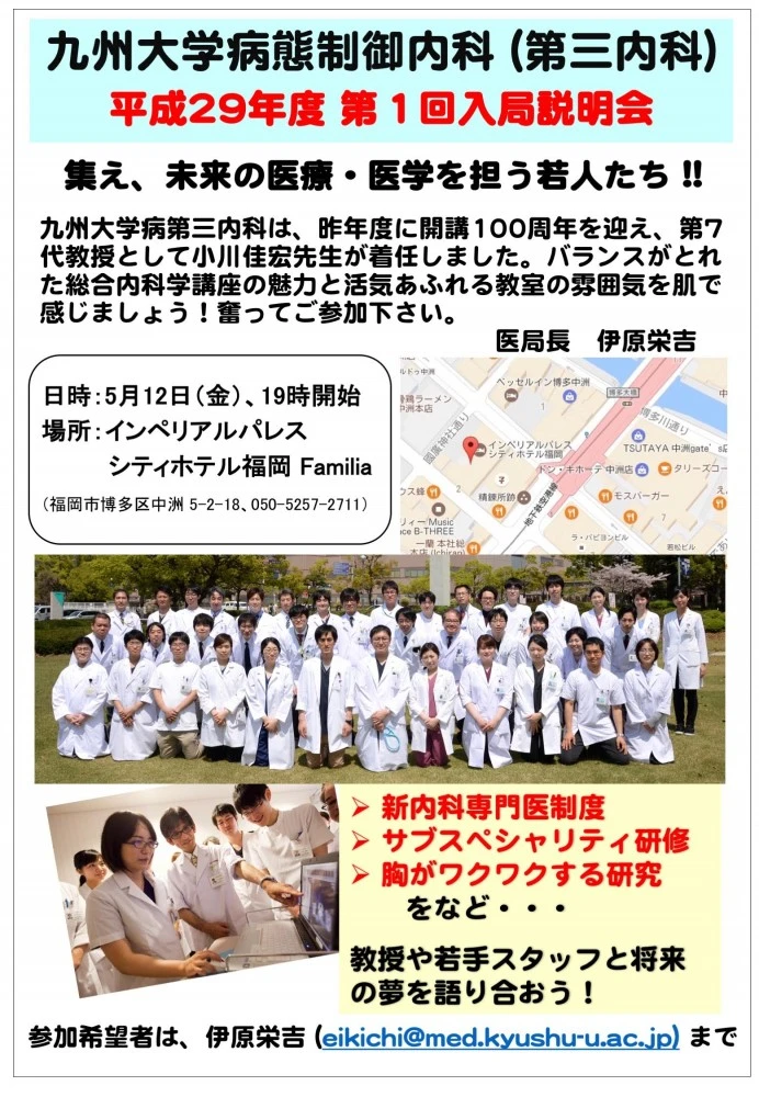 来る5月12日(金)、九州大学病態制御内科(第三内科)の第1回入局説明会を開催いたします!