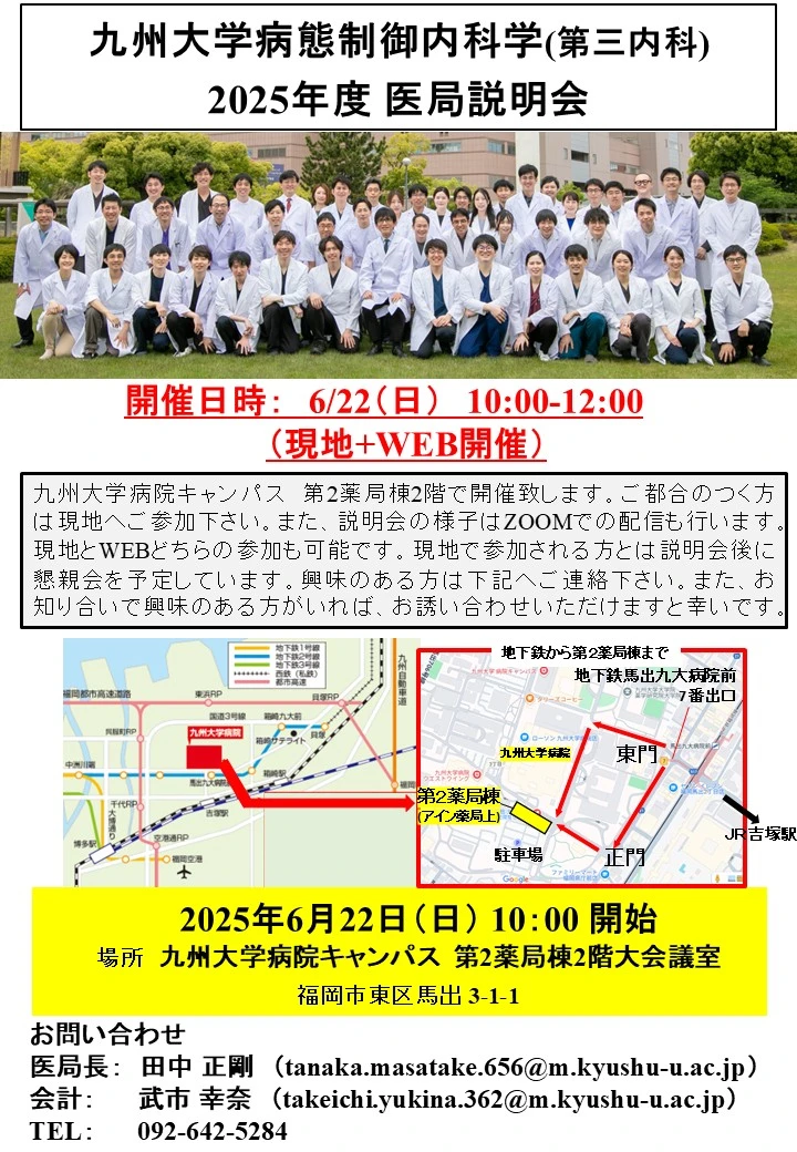 第三内科の診療・研究活動、教育体制、キャリアパスについてご紹介し、当科の雰囲気を感じて頂ける良い機会になると思います。 前回、御参加頂けなかった方はもちろん、前回参加したけれどもう一度三内科を満喫したいという方もご参加をお待ちしています! 少しでも当科へご興味がある方は是非ともご参加ください!